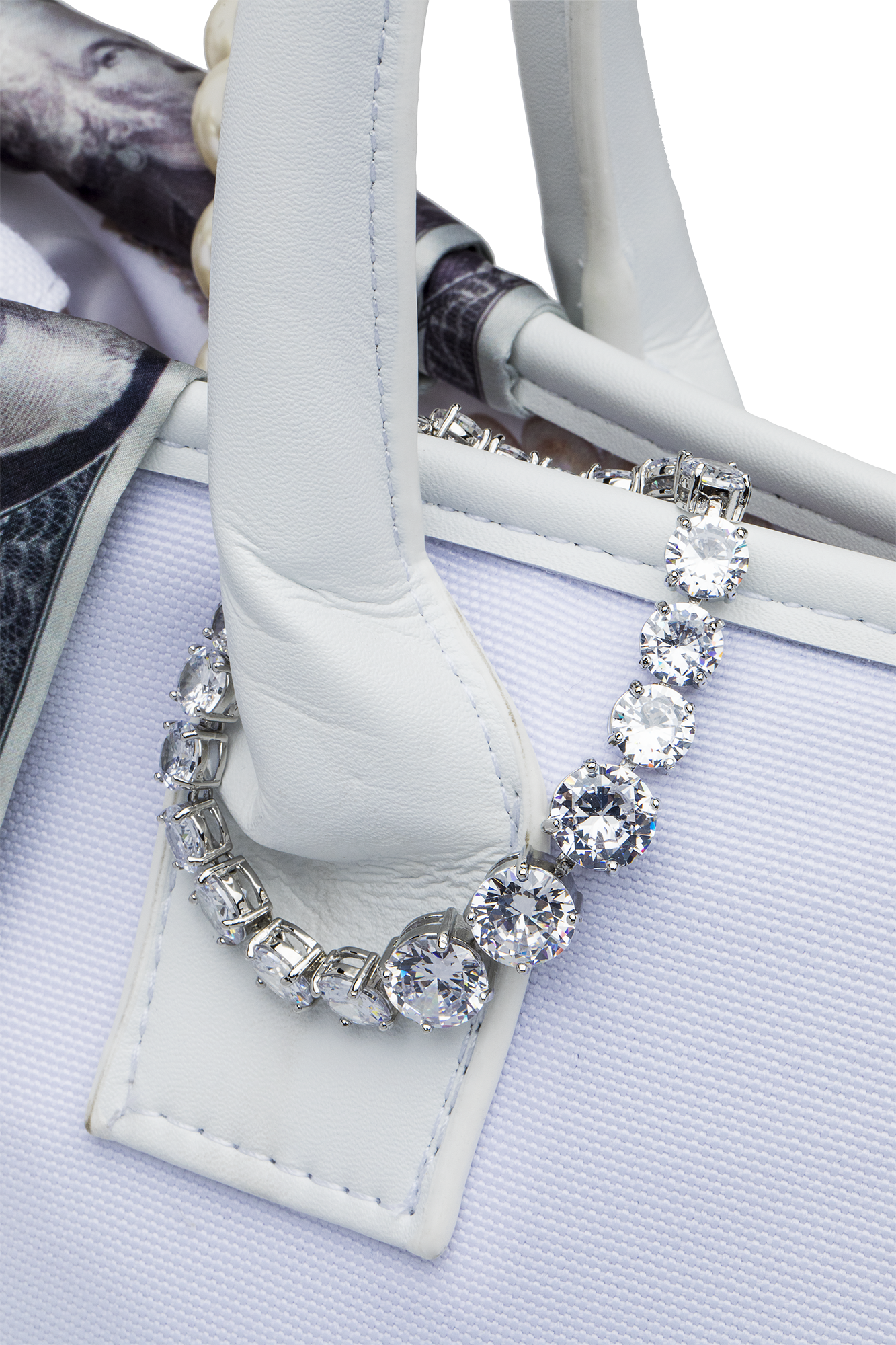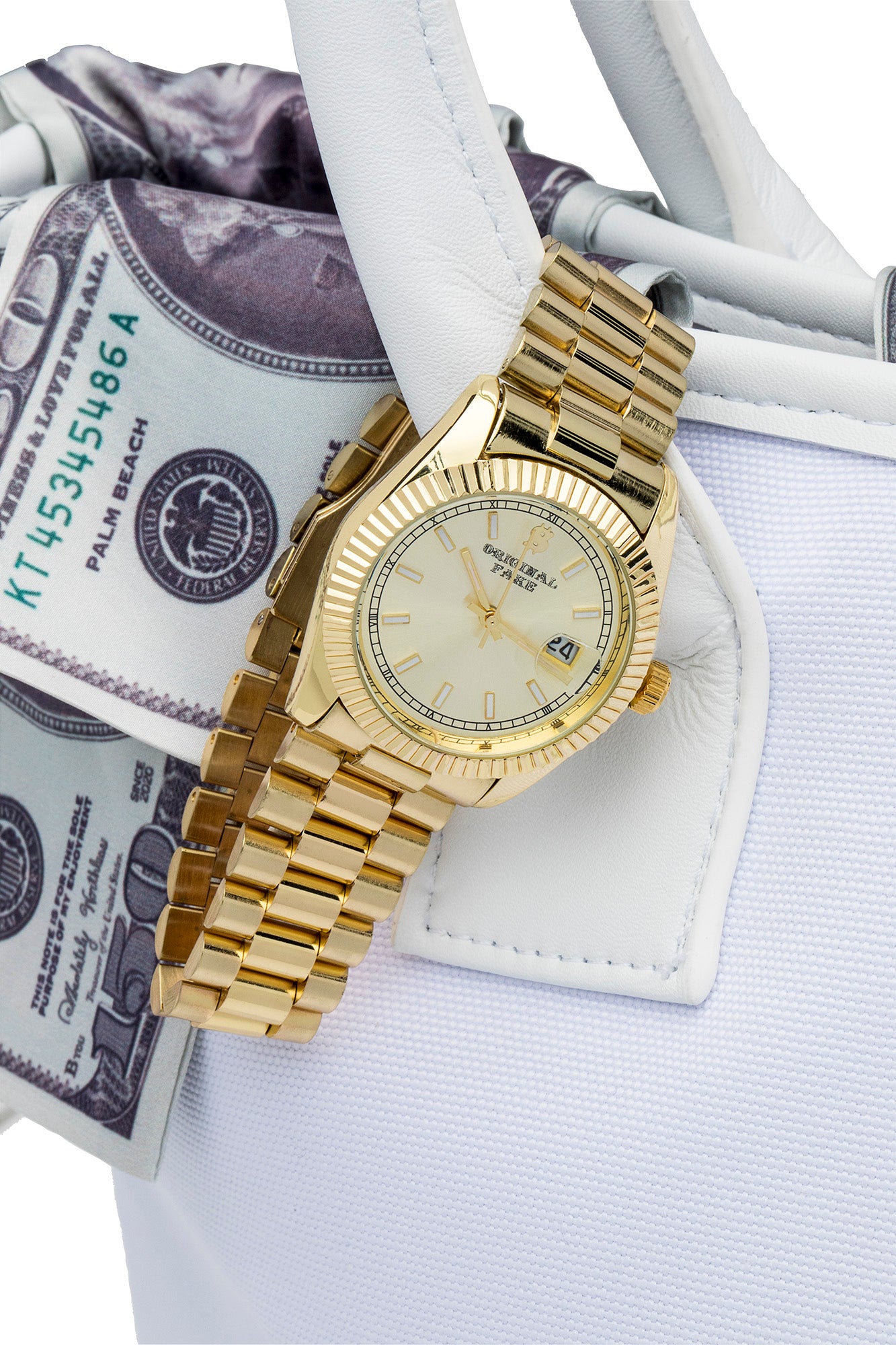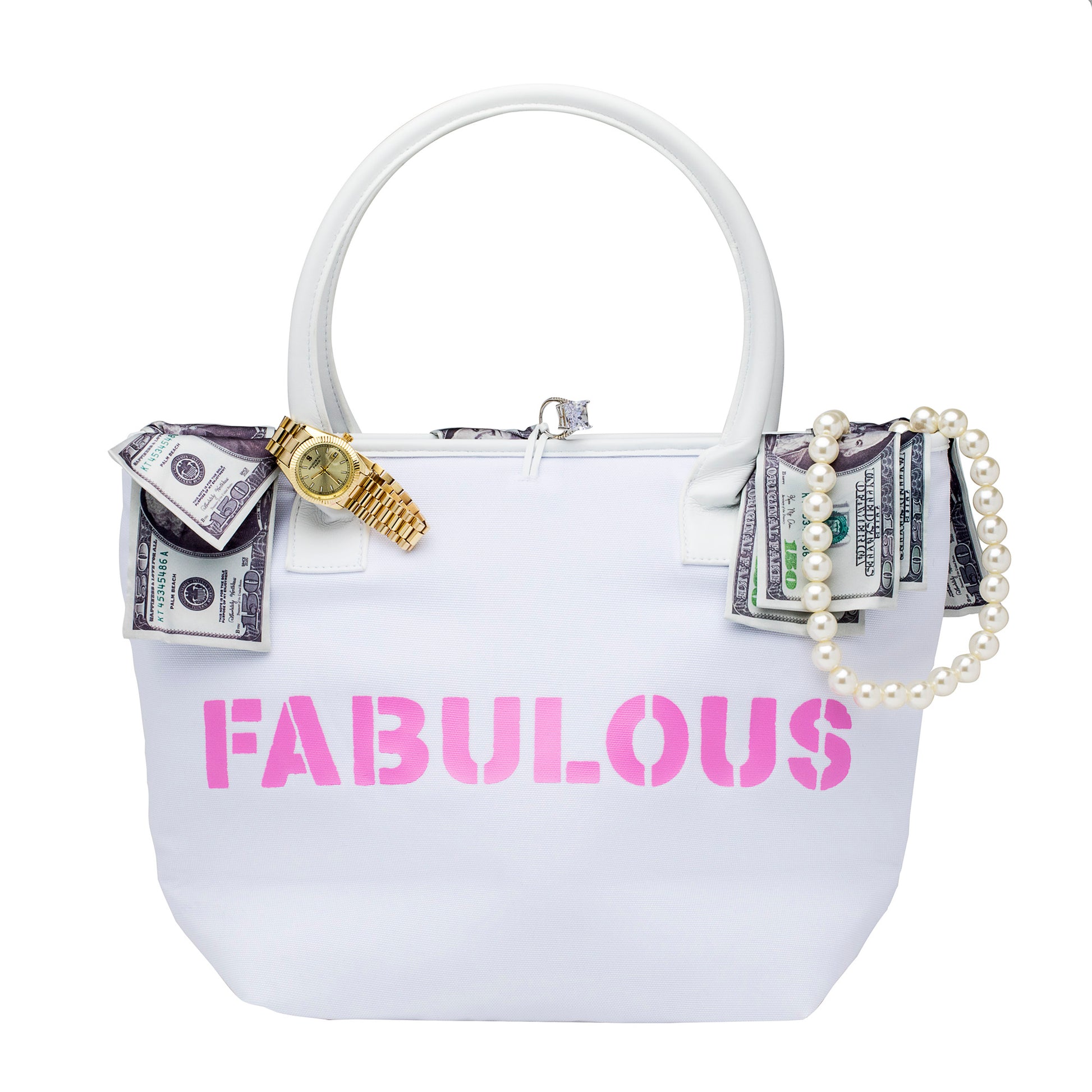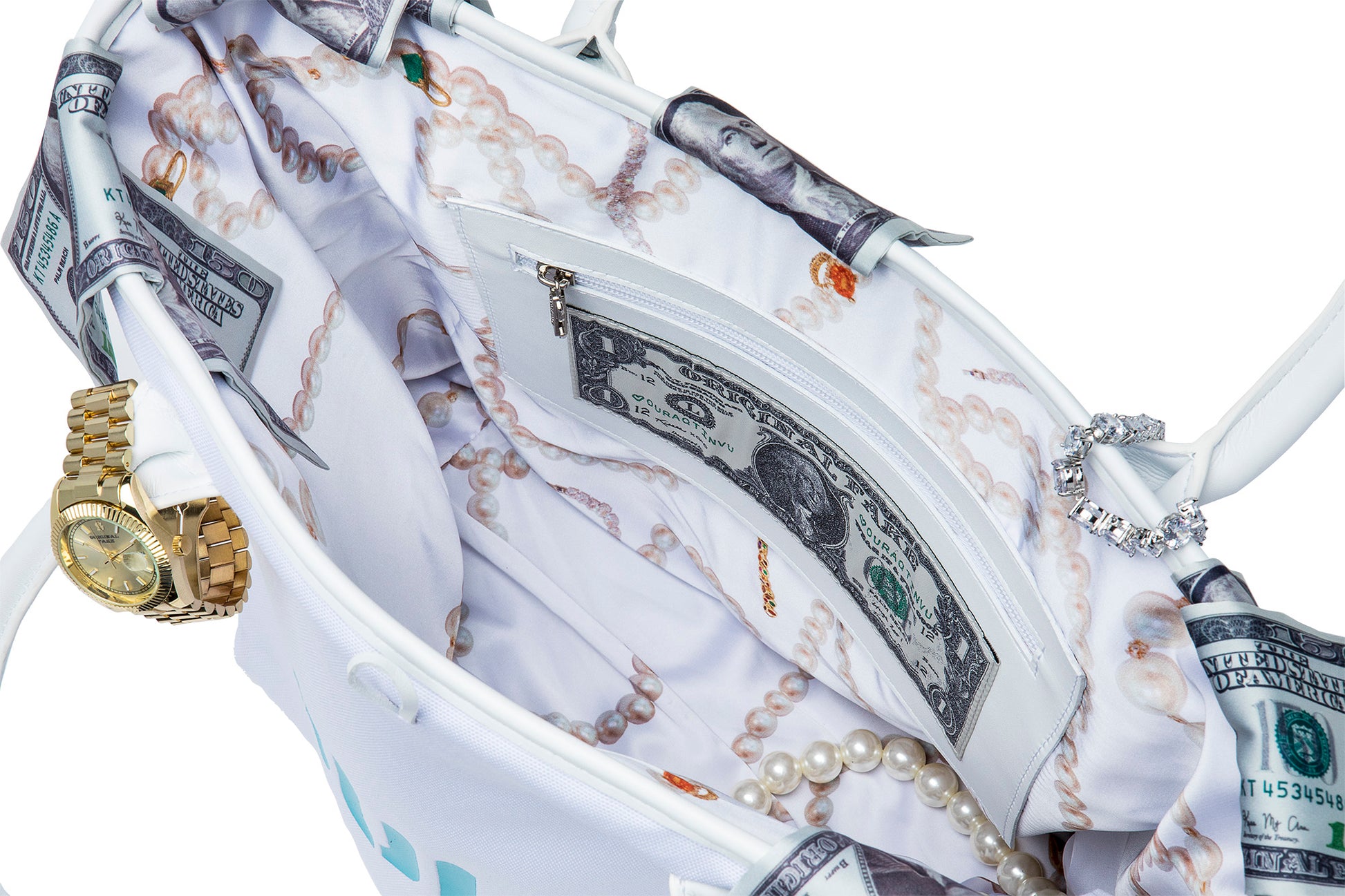 Our statement carryall is overflowing with silky $150 bills because, hey, who cares if a few fall out? It comes fully loaded as you see it with all the trappings of a luxurious Rodeo Drive day of shopping- a working Original Fake watch, a sparkling crystal tennis bracelet, an impressive strand of faux South Sea pearls and a good old fashioned luxury sized mega rock ring as a clasp.