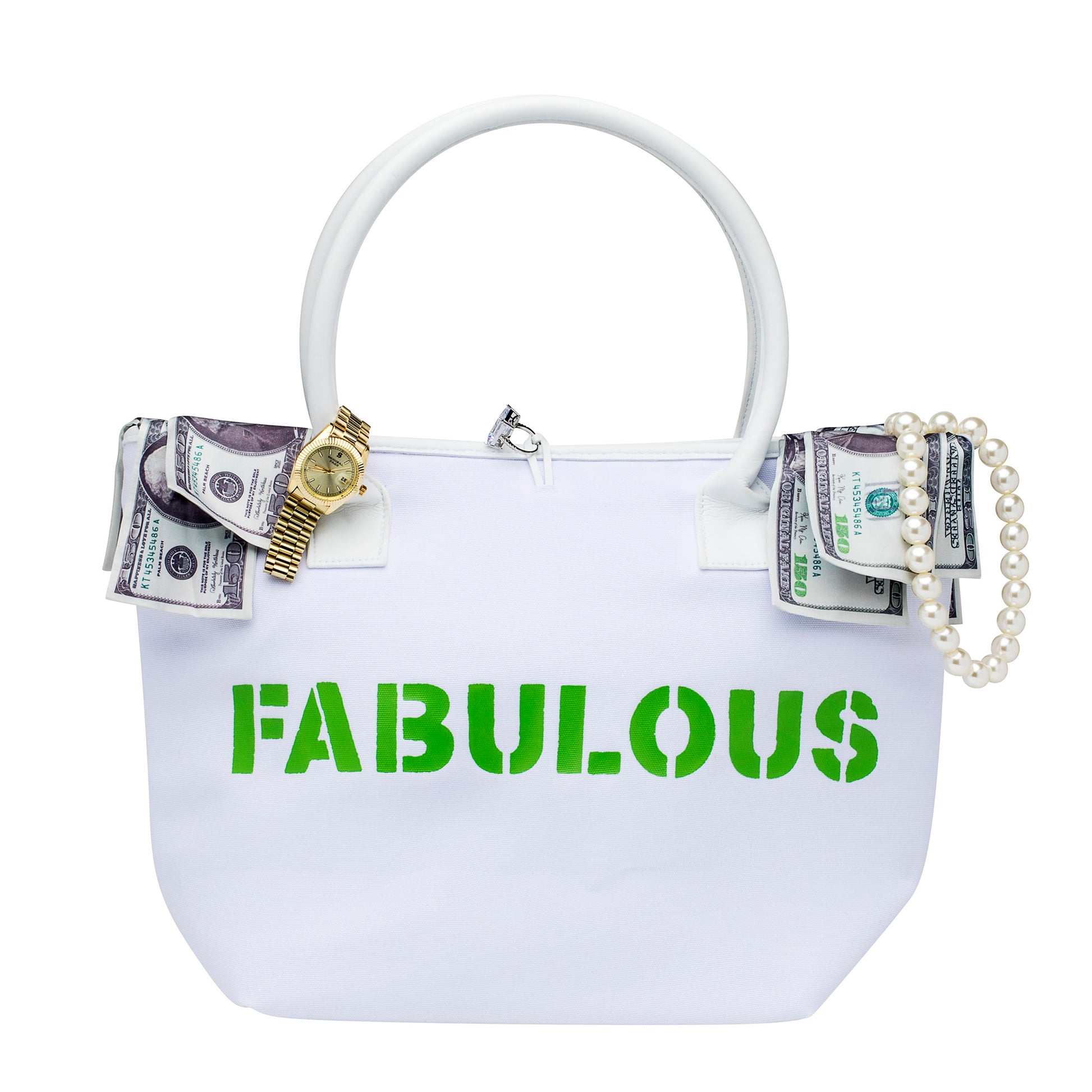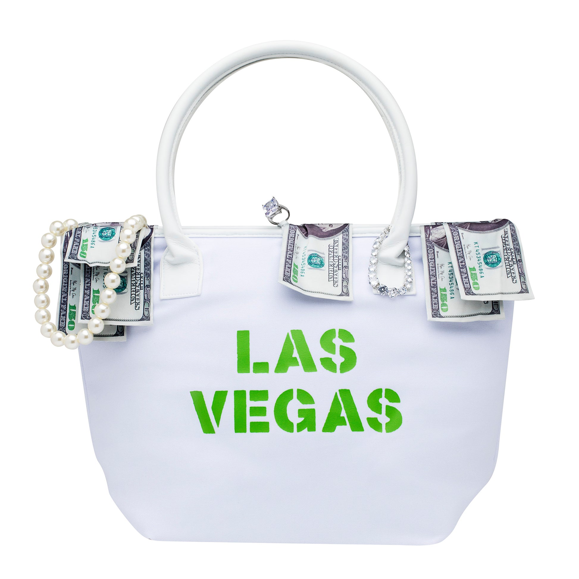 Front of bag says Las Vegas in green color raised vinyl print. Back of bag says Fabulous.